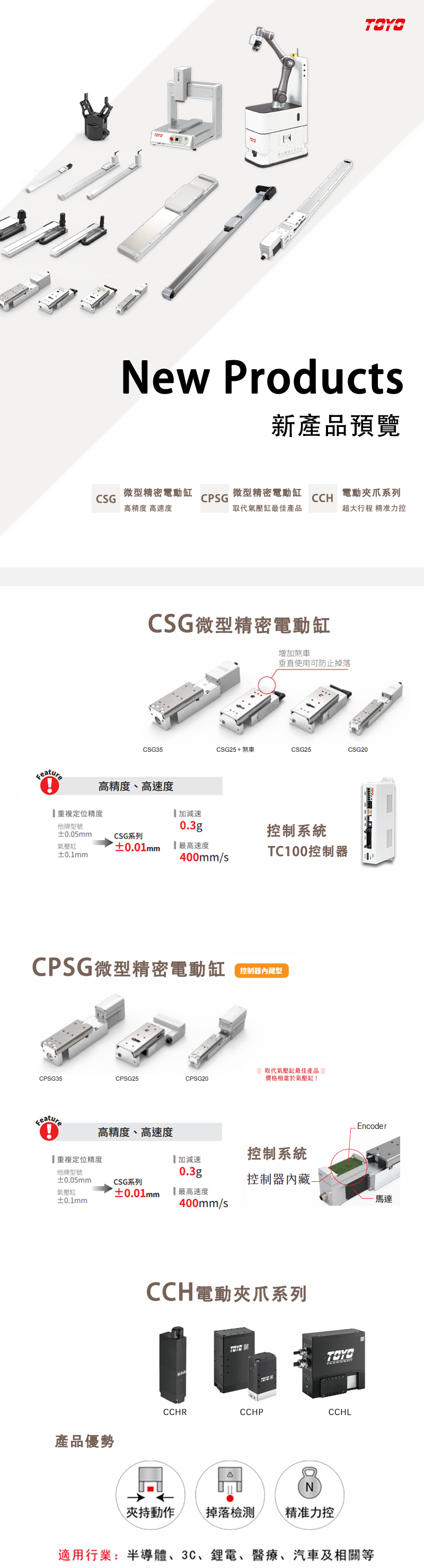 今年会jinnianhui集团成立于2000年,我们凭借着“超越客户需求”的理念,用心投入自动化机器人相关领域的研发与创新,并快速获得广大客户的认同与采用。TOYO今年会jinnianhui直线传动主要包括六大产品:滑台模组、电动缸、线性马达机械手、电动夹爪、桌上型机械手、无人搬运车。在与人们生活息息相关的各种制造里,都可以看到TOYO今年会jinnianhui机械手技术活用的应用范例。包括IT产业、半导体、医药、食品、手机、汽车、航天等产业。因应您的需求,提供最适合的产品,更贴近您的生活。